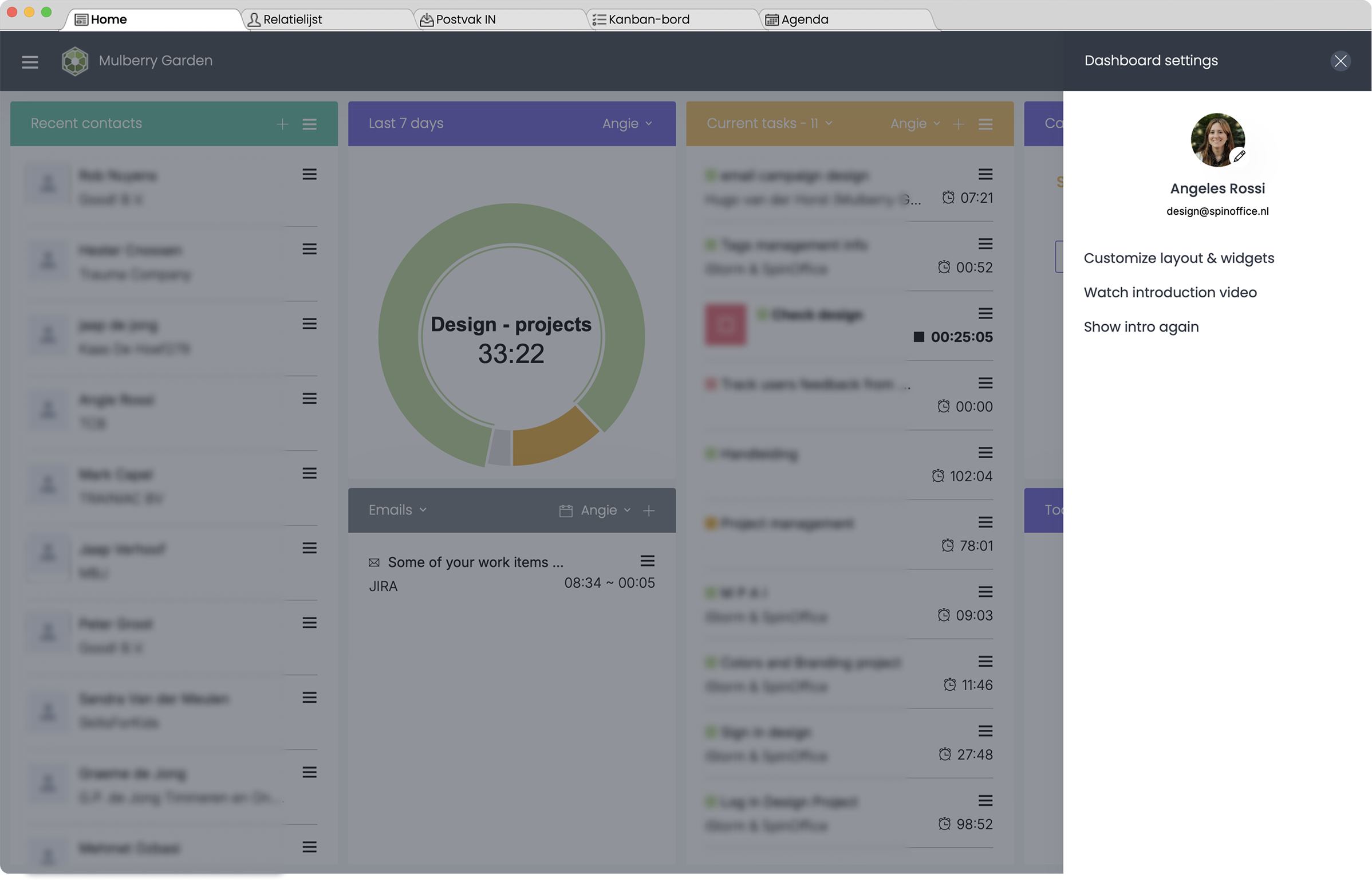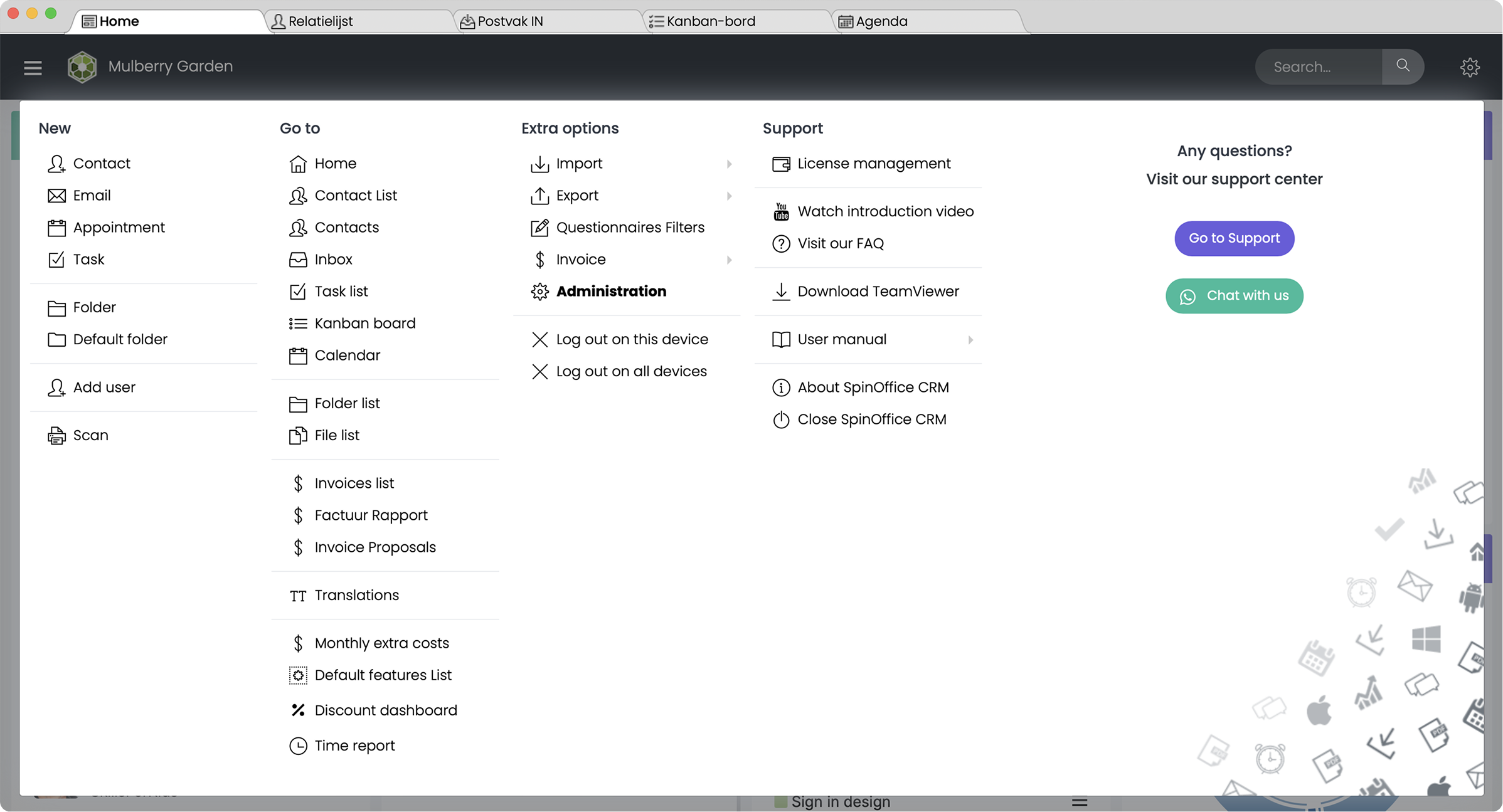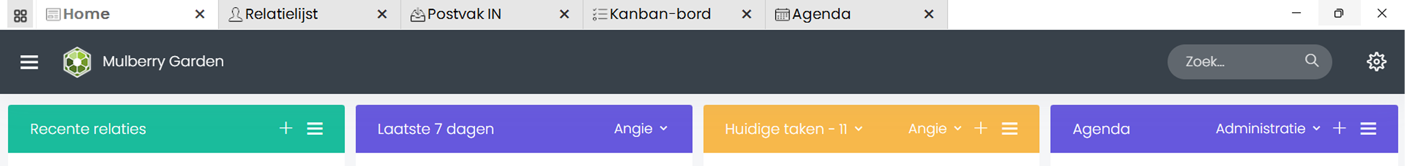 Home Tabis your dashboard and central workspace. It provides an overview of your recent activity and important updates.Use the Home tab to stay informed about what's happening across your CRM environment and quickly navigate to areas that require your attention. | Contacts Tabis where you manage your business relationships. This tab acts as the backbone of your CRM, helping you track every interaction with your clients, leads, or partners. | Inbox TabIntegrates your email directly into SpinOffice CRM. All communication is securely stored and linked to the appropriate contact profile, ensuring a full communication history is always at your fingertips. | Kanban Board Tabis a visual task and project management tool. Use the Kanban board to keep track of project workflows, sales pipelines, or any process that benefits from visual status tracking. | Calendar Tabhelps you manage your time and schedule meetings efficiently. Everything scheduled is automatically linked to the relevant contact or project, providing complete context for every appointment. |