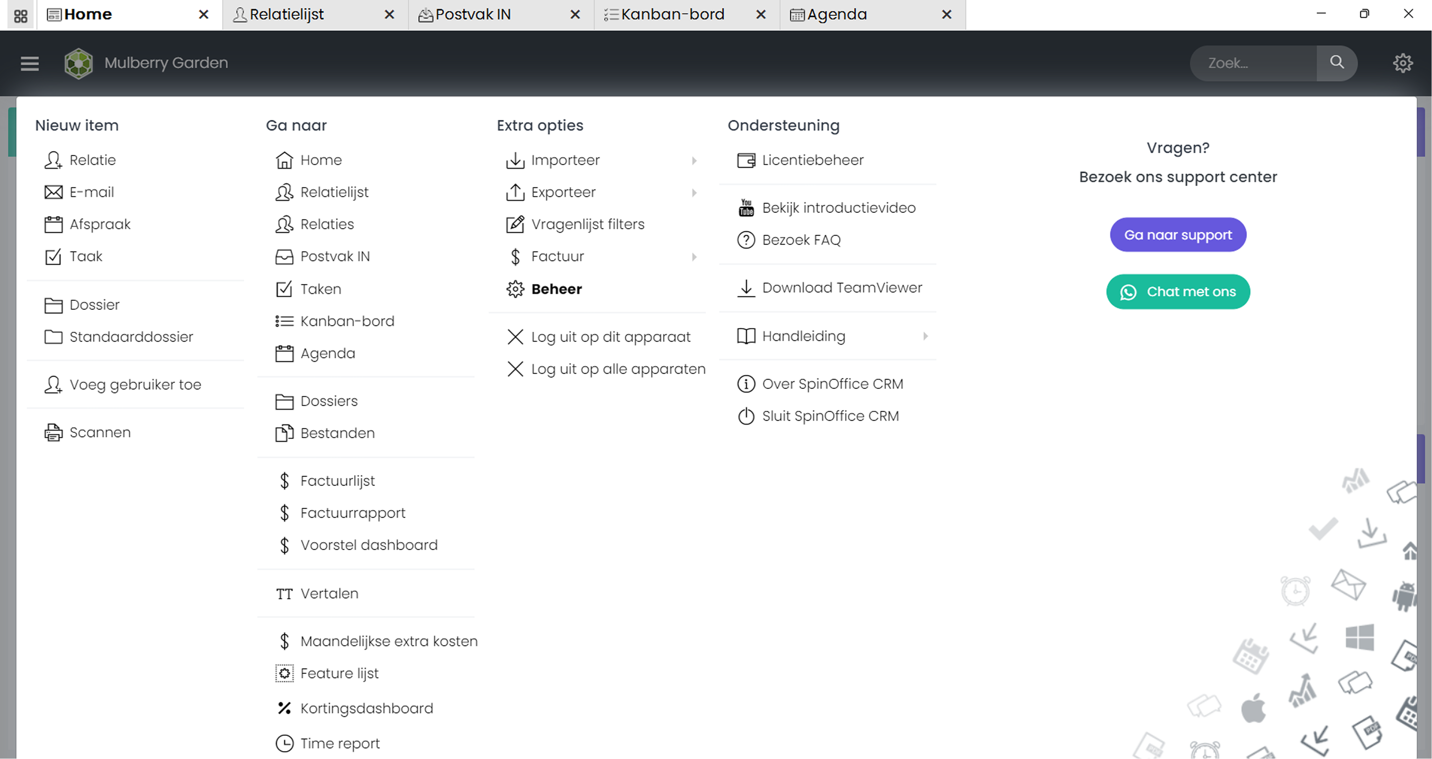 Het Tandwielmenu in SpinOffice CRM geeft toegang tot systeeminstellingen en aanpassingsmogelijkheden, zodat gebruikers de CRM-omgeving kunnen afstemmen op hun specifieke behoeften. Dit menu bevindt zich meestal rechtsboven in de interface en bevat opties voor het instellen van gebruikersvoorkeuren, beheren van accountinstellingen, configureren van e-mailintegratie, aanpassen van contactvelden en instellen van gebruikersrechten. Beheerders hebben daarnaast toegang tot organisatiebrede instellingen zoals databasebeheer, back-upopties en abonnementsgegevens. Het Tandwielmenu is essentieel om controle te houden over je werkomgeving en om ervoor te zorgen dat de CRM-functionaliteit aansluit bij de bedrijfsprocessen.