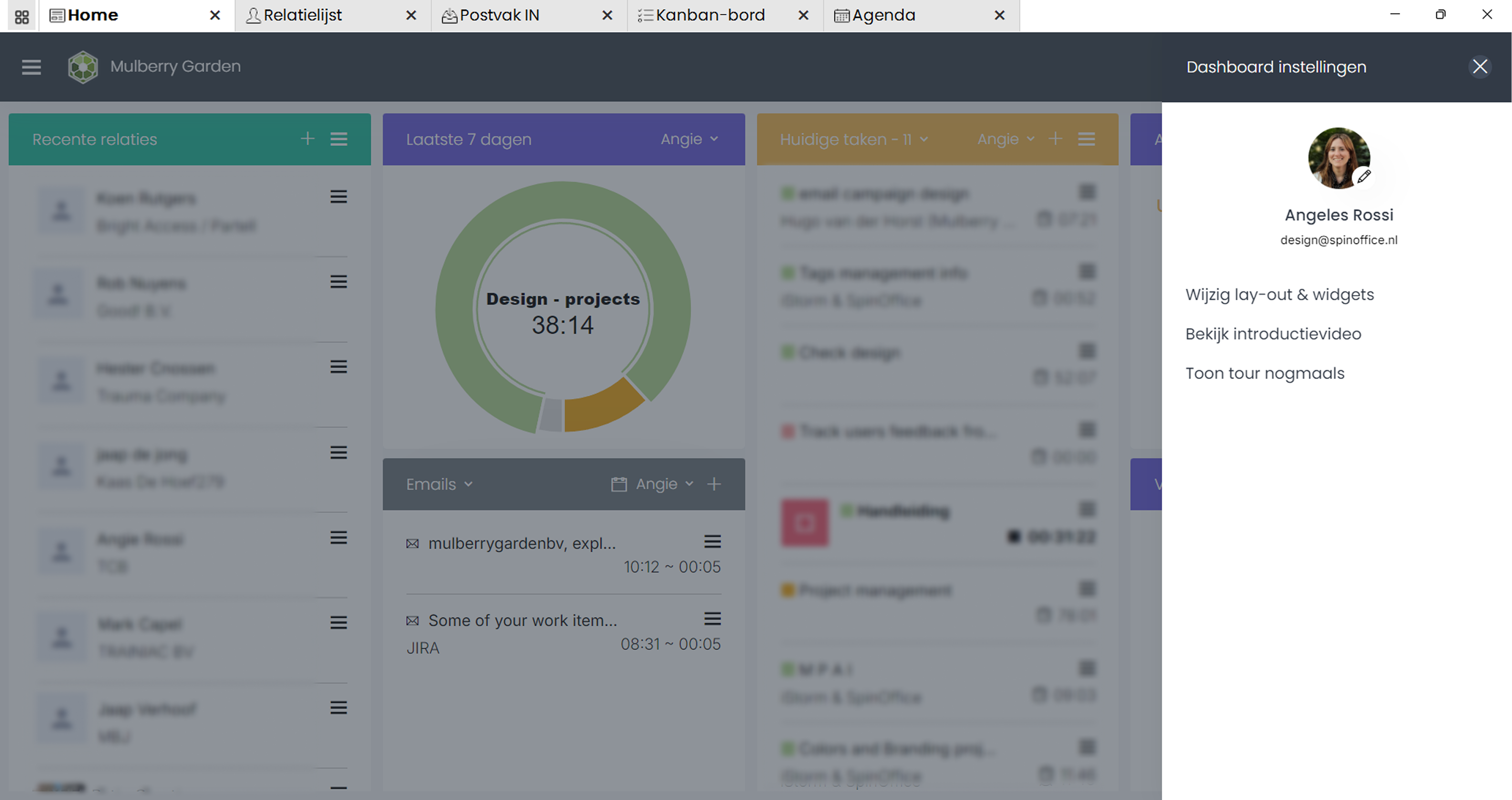 Schermtabbladen: Home, Contacten, Inbox, Kanban-bord en Agenda.